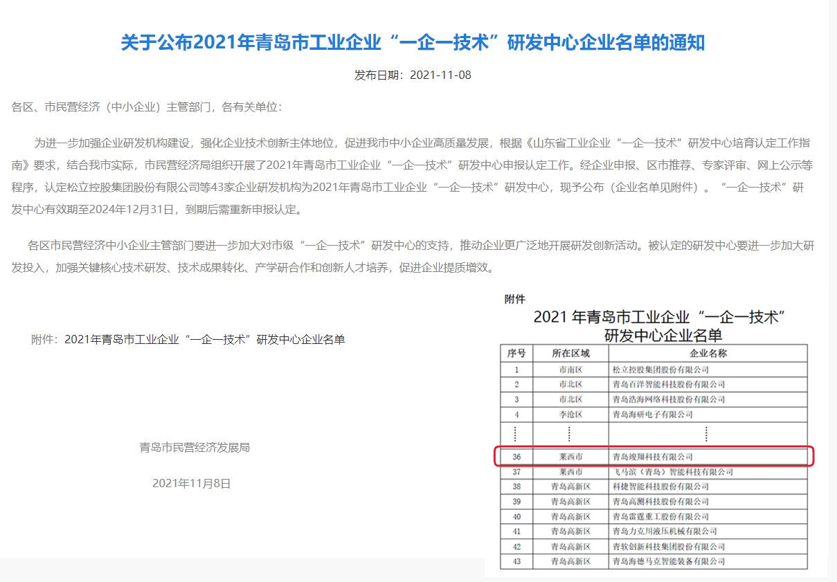為進(jìn)一步加強(qiáng)企業(yè)研發(fā)機(jī)構(gòu)建設(shè),強(qiáng)化企業(yè)技術(shù)創(chuàng)新主體地位,促進(jìn)青島市中小企業(yè)高質(zhì)量發(fā)展,包括我公司在內(nèi)的43家企業(yè)研發(fā)機(jī)構(gòu)被認(rèn)定為2021年青島市工業(yè)企業(yè)“一企一技術(shù)”研發(fā)中心。